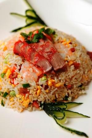 3. Pour in beaten eggs and scramble slightly. Add in rice, salt, soy sauce, sugar, white pepper and some water – stir-fry for a few seconds. Then add barbecued pork and green peas. Continue frying for several minutes till rice is aromatic.