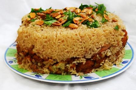 Sprinkle a casserole dish with salt, spread the garlic on the bottom and then add the lamb and onions. Top the mixture with the eggplant slices, cauliflower florets and the rice. Pour over just enough of the stock to cover the rice, bring to a boil and then cover tightly. Reduce the heat and simmer until the rice is cooked and the liquids absorbed